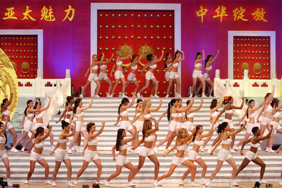 圖為2005年4月9日,在廣州舉辦的第36屆亞洲小姐比賽中,參賽佳麗集體“表演”中國功夫。