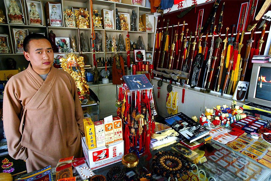 姜文說,步子邁大了,容易扯著蛋。在步子越邁越大的少林寺商業開發進程中,從賴以發家的“少林功夫”,到其依託的少林寺佛教文化,都在經歷眾說紛紜的陣痛。從“少林火腿腸”的鬧劇,到世界性的搶注“少林”商標風潮,一座千年古刹在另類的復興之路上難掩力不從心的悲涼。圖為2004年11月4日,一名少林寺僧人在紀念品商店中售賣少林寺相關商品。
